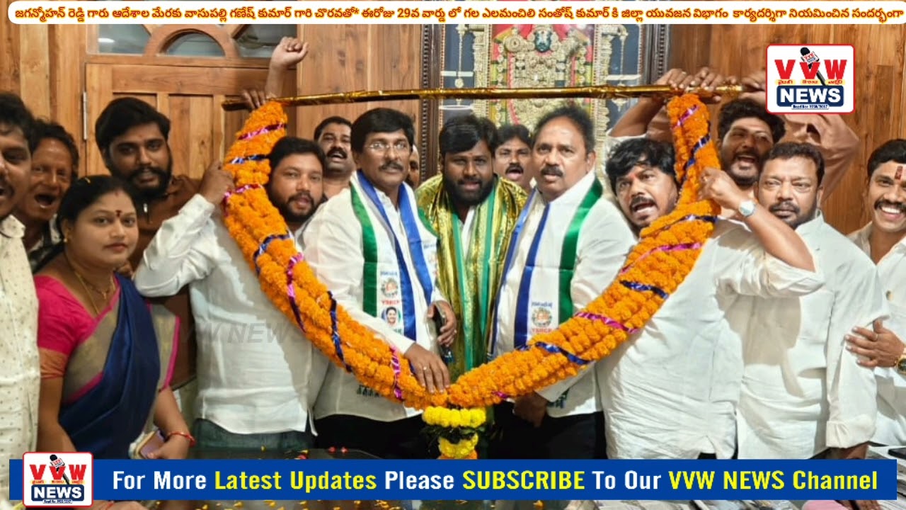 *జగన్మోహన్ రెడ్డి గారు ఆదేశాల మేరకు వాసుపల్లి గణేష్ కుమార్ గారి చొరవతో* ఈరోజు 29వ వార్డు లో గల ఎలమంచిలి సంతోష్ కుమార్ కి జిల్లా యువజన విభాగం కార్యదర్శిగా నియమించిన సందర్భంగా *మాజీ శాసన సభ్యులు సభ్యులు వాసుపల్లి గణేష్ కుమార్ గారిని, రాష్ట్రు క్రిస్టియన్ మైనార్టీ విభాగం అధ్యక్షులు శ్రీ జాన్ వెస్లీ* గారిని మర్యాదపూర్వకంగా కలిసి సాలువ కప్పి స్వీట్ అందించిన భారీ గజమాలతో. సన్మానించిన. ఎలమంచిలి సంతోష్. కుమార్ … ఎలమంచిలి సంతోష్ కుమార్ మాట్లాడుతూ.. నాకు ఈ పదవికి సహకరించిన .. వార్డ్ ప్రెసిడెంట్ పీతల వాసుకు, రాష్ట్ర యువజన విభాగం సెక్రటరీ కనకల ఈశ్వర్ కి కృతజ్ఞతలు తెలిపిన సంతోష్